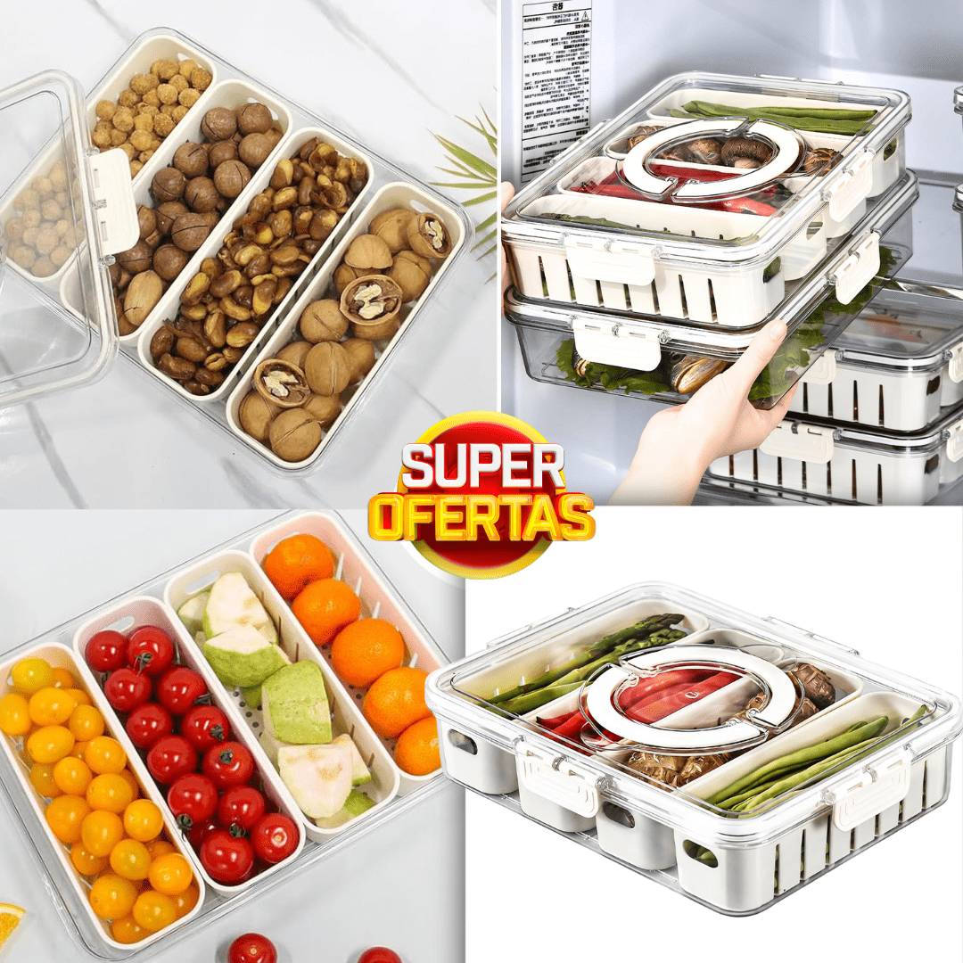 Caja de almacenamiento con compartimentos extraíbles para una fácil organización de snacks, verduras y frutas.