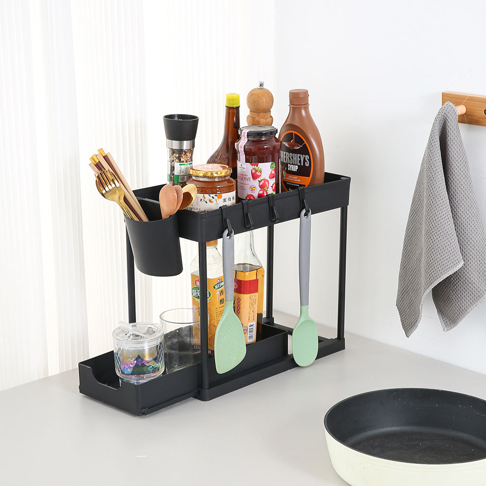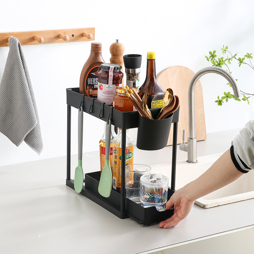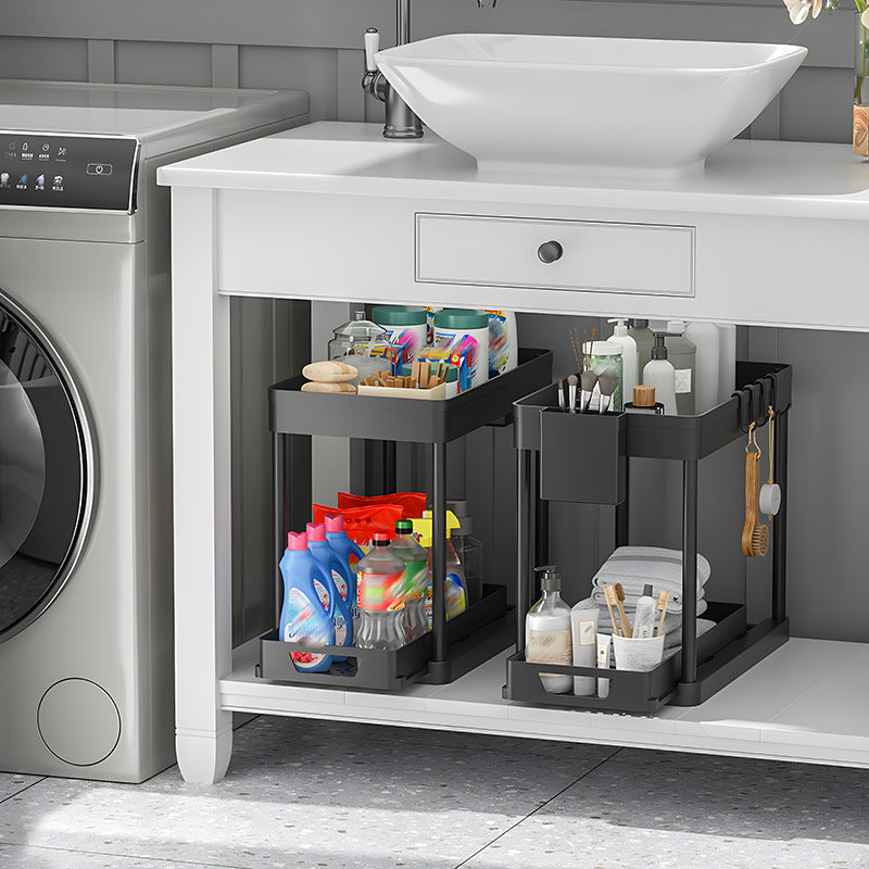 Este organizador de 2 niveles para debajo del fregadero maximiza el espacio gracias a su diseño escalonado.