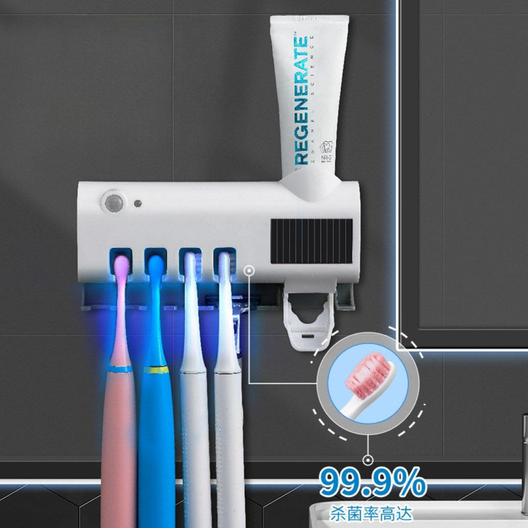 Tienes un dispensador automatico de pasta dental. Solo colocas el cepillo y la pasta sale sola. Higiénico, práctico y sin desperdicio.