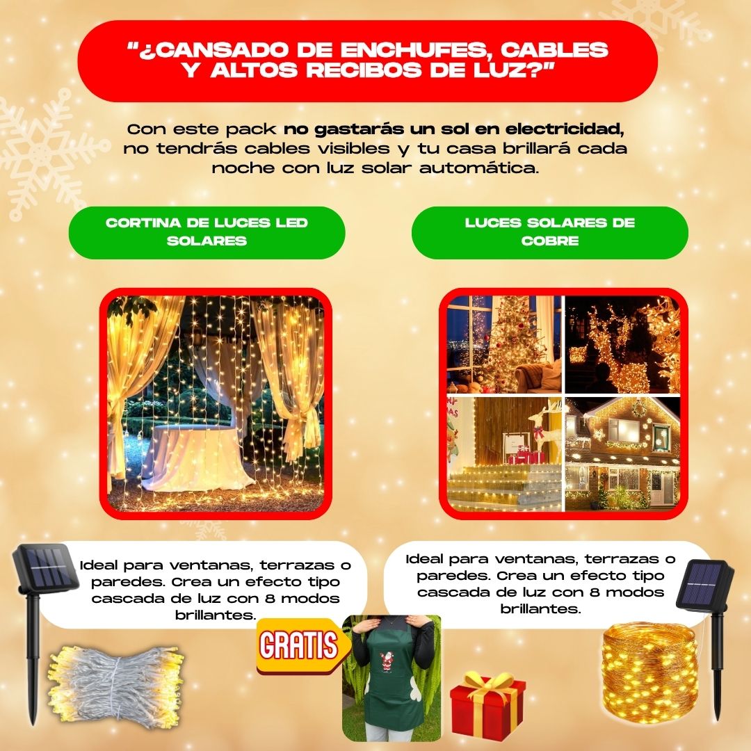 PACK NAVIDEÑO (CORTINA DE LUCES LED SOLARES + LUCES SOLARES DE COBRE) + REGALO - M0361